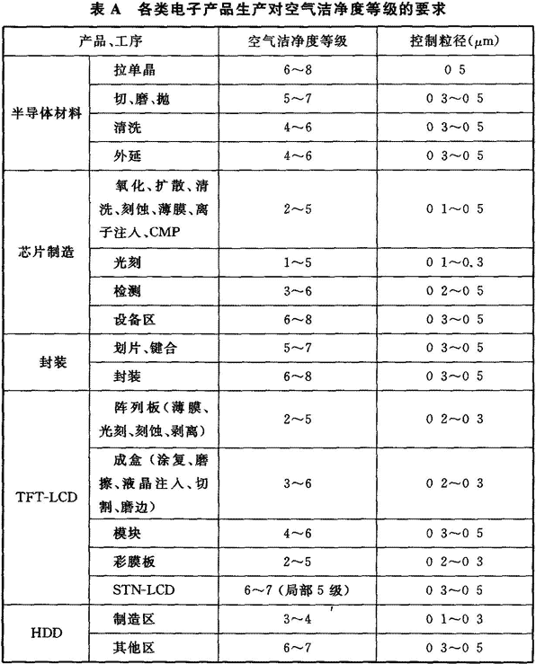 附錄A 各類電子產(chǎn)品生產(chǎn)對空氣潔凈度等級的要求