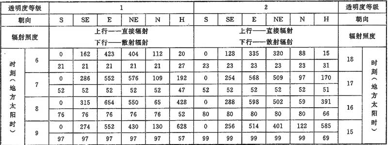 D.0.1 計算夏季空調(diào)冷負荷時,透過建筑物各朝向垂直面與水平面標準窗玻璃的太陽直接輻射照度和散射輻射照度應(yīng)按表D.0.1-1~表D.0.1-7采用。