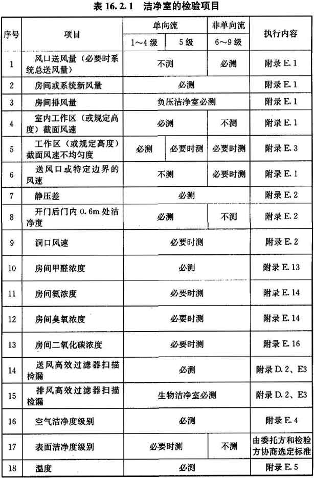 16.2.1 潔凈室在高效過濾器現(xiàn)場檢漏后的必測項目,應符合表16.2.1的要求,也可由該表選擇選測項目。