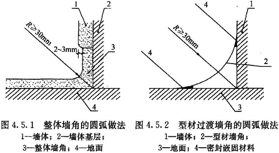 4.5.1 地面與墻面的夾角應(yīng)為曲率半徑只不小于30mm的圓角。當(dāng)用柔性材料粘貼地面時(shí),在墻面上應(yīng)延伸至地面以上形成圓角并與墻面平齊,或略縮進(jìn)2mm~3mm,突出的墻面應(yīng)圓滑過渡(圖4.5.1)。需經(jīng)常沖刷的地面,地面材料在墻面上延伸高度應(yīng)大于150mm。
