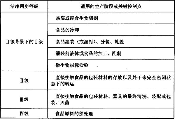 注:表中生產(chǎn)階段或關(guān)鍵控制點(diǎn)應(yīng)符合本規(guī)范表4.2.1的說(shuō)明,具有高污染風(fēng)險(xiǎn),才適用Ⅱ級(jí)背景下的Ⅰ級(jí)(含設(shè)備自身具備的)的條件,如冷卻階段中的月餅、酸奶的冷卻,檢驗(yàn)階段中的一般理化檢測(cè)則不適用此種條件。